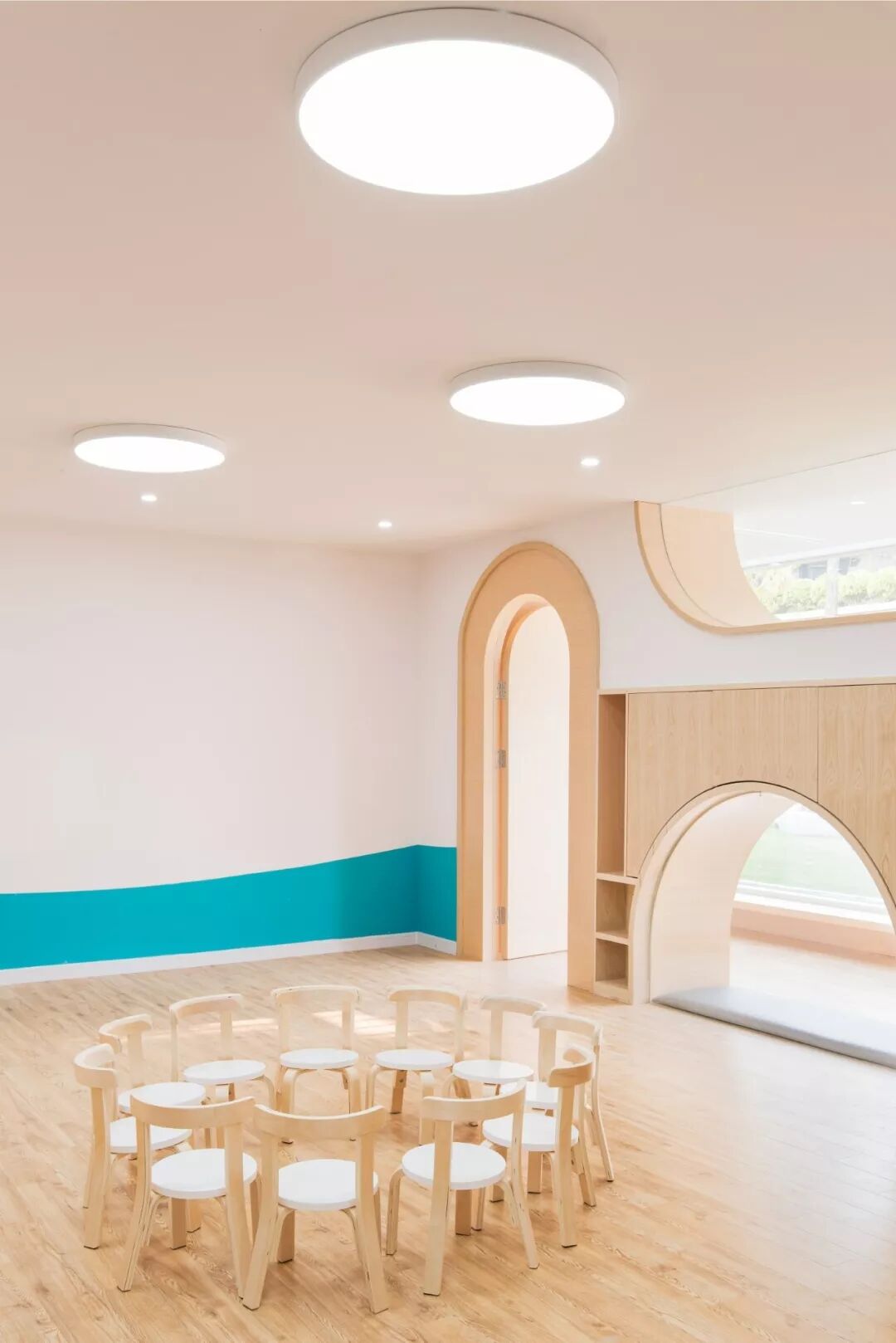考虑到早教中心学员的年龄,我们在过道墙体顶部和底部设置了圆弧形的窗口,保证室内外视线互不干扰的同时也让家长踮起脚、弯下腰就可以眼见心安。这种窗的变形操作是让家长们在无形中主动感受儿童尺度的积极尝试。