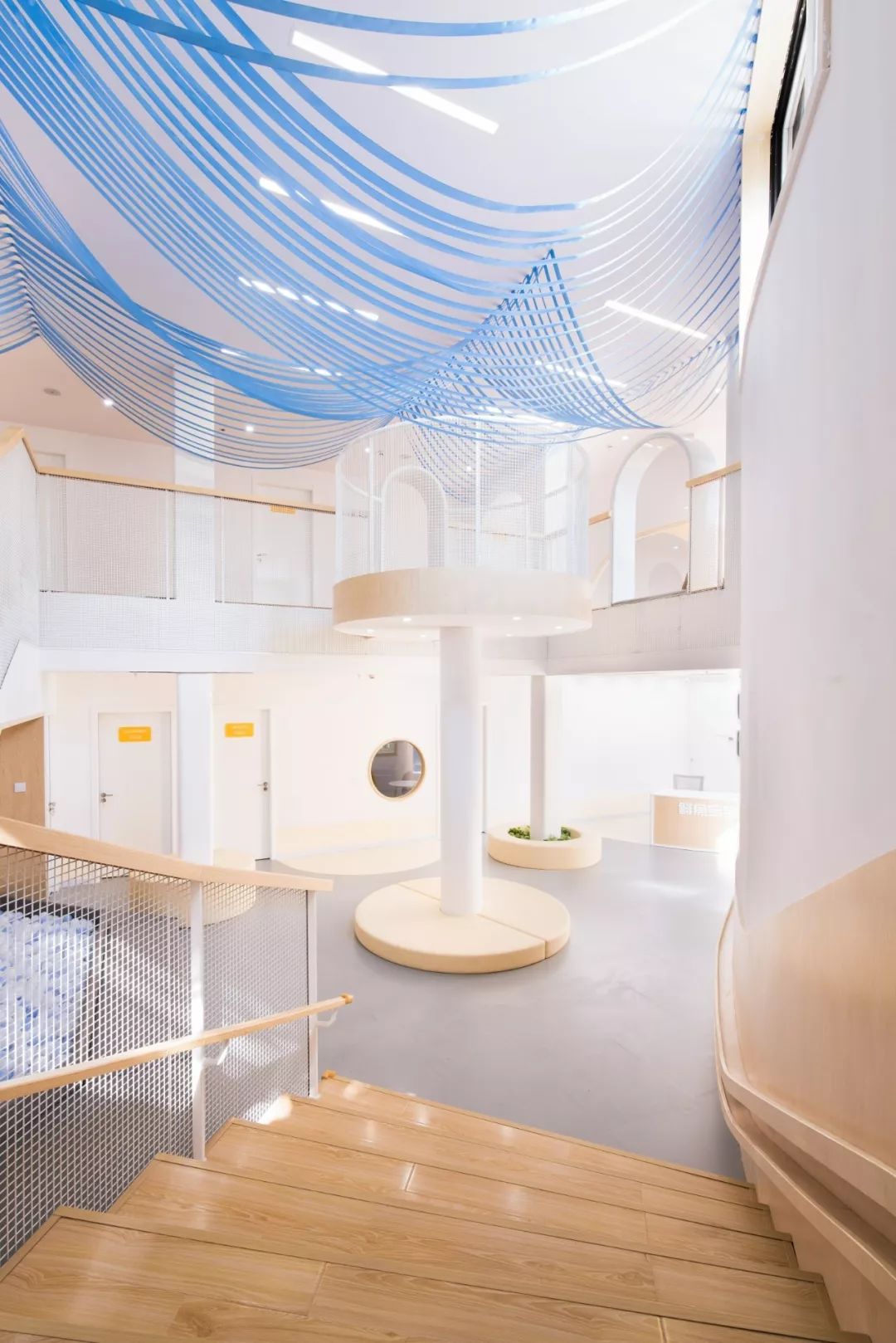 整个空间的高潮出现在大厅蔚蓝色波浪形状的天空。用计算机数字化技术模拟重力找形得到的天花由90根长短不一的绸带组成。这些荡漾着童年浪漫柔软的线条,将阳光切割出粼粼波光。