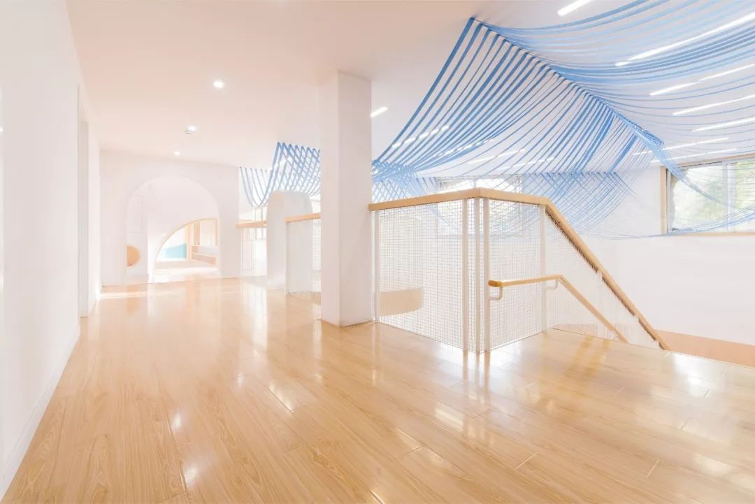 在“翻转”和“加厚”两步操作后,走道一侧的落地玻璃窗既引入了室外的风景,又使得过道自身也成为了风景的舞台,孩子们的游戏路径也从单一变得多元且富有想象力。